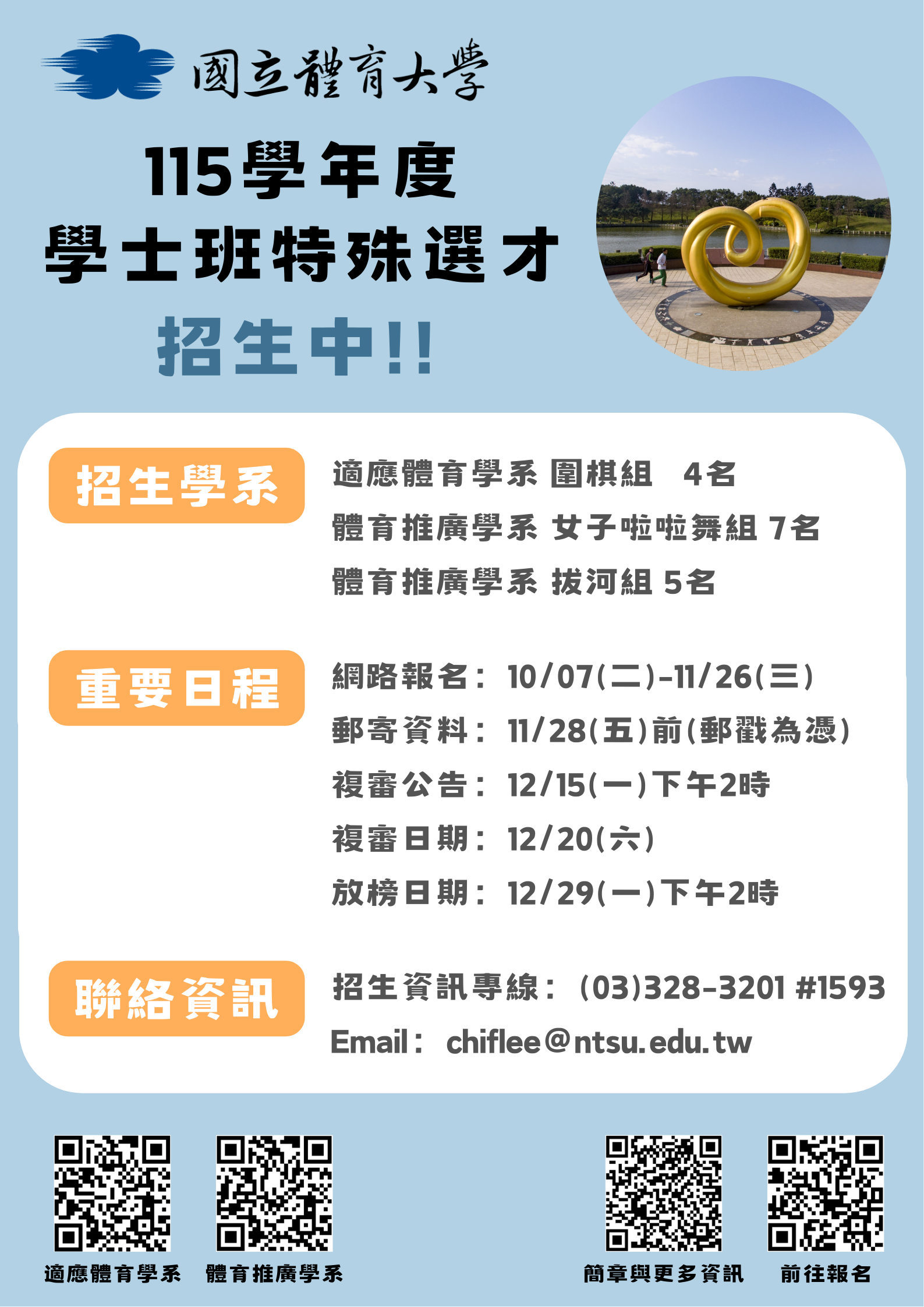 【高中部】轉知:國立體育大學115學年度學士班特殊選才招生資訊