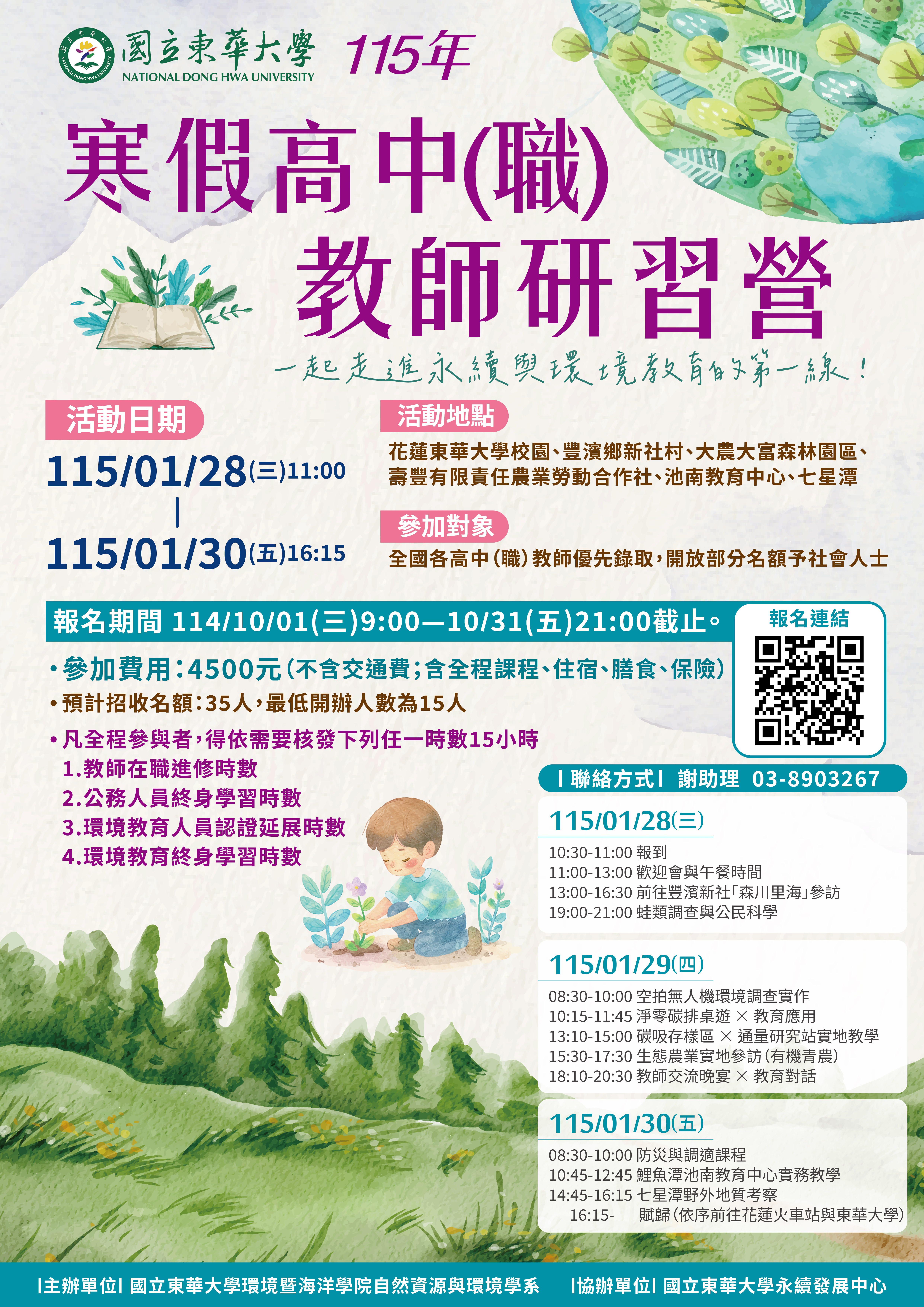 一、 | 本校自然資源與環境學系擬於明年(115年)舉辦【115年寒假高中職教師研習營活動】,以各高中(職)教師為對象,透過研習活動提供大學端與高中端最新資訊交流平台,聚焦於永續發展、自然環境與社會生態等議題。這有助於教師掌握大學教育趨勢並增進對大學系所現況之瞭解。同時我們期望通過與高中端的對話更加了解高中的需求,從而協助教師引導學生做好進入大學前的規劃與準備,特別是在環境和永續發展領域。 |