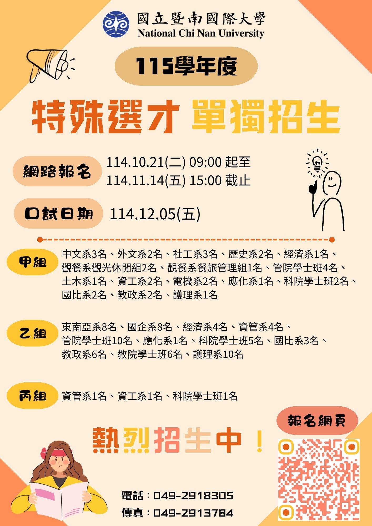 一、 | 國立暨南國際大學115學年度特殊選才單獨招生網路報名自114年10月21日起至114年11月14日止。 |