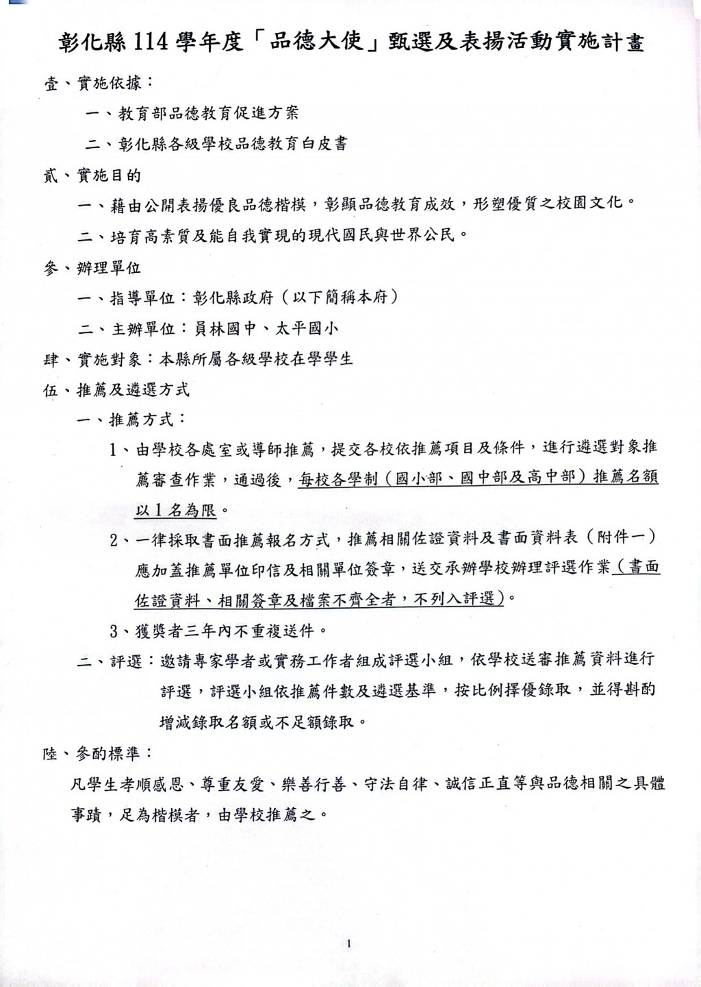 彰化縣114學年度「品德大使」甄選及表揚活動實施計畫