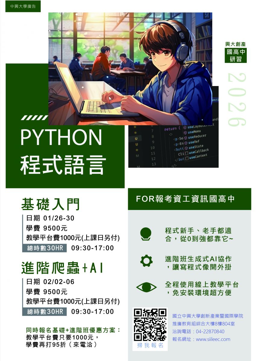 轉知:國立中興大學2026年寒假Python程式設計系列、ACP與SSE色彩學國際證照輔導、AI應用故事 X 探索島系列招生海報與簡章,即日起開放報名,敬邀學生踴躍報名參加