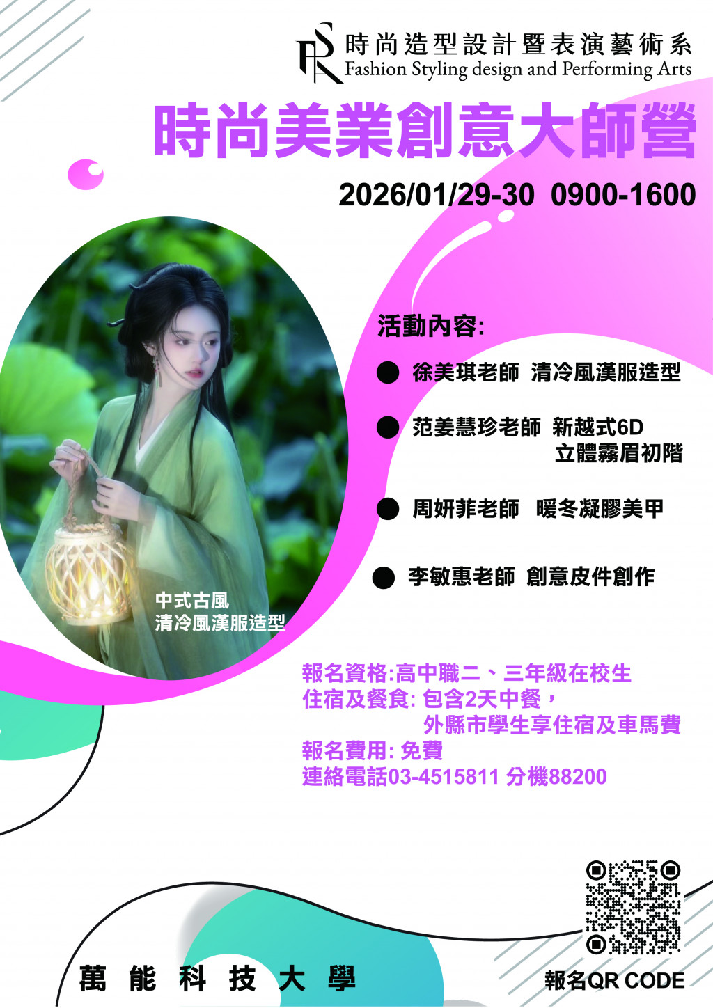 轉知:萬能科技大學時尚造型設計暨表演藝術系辦理「時尚美業創意大師營」及「時尚大明星訓練營」,竟邀有興趣同學踴躍參加