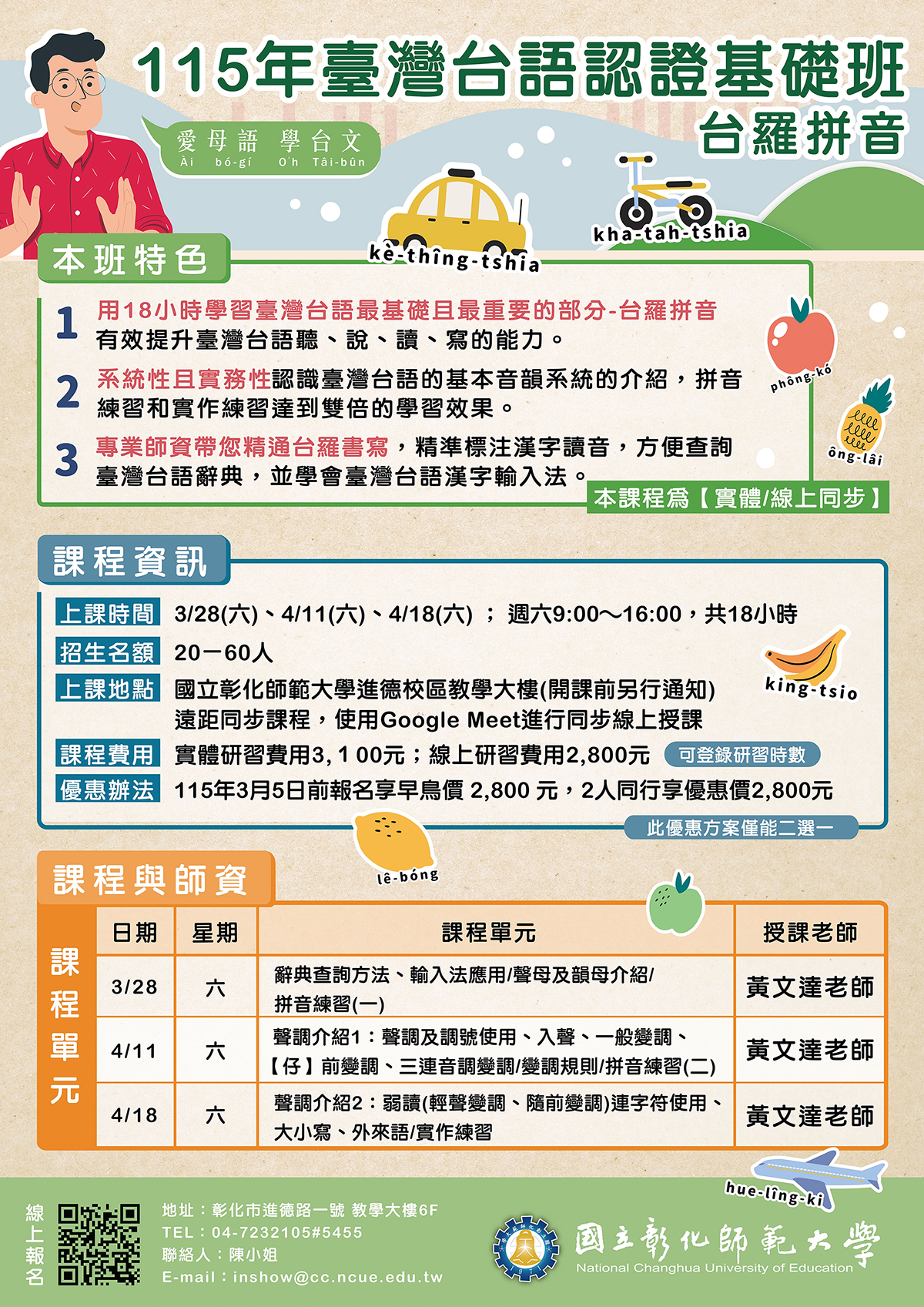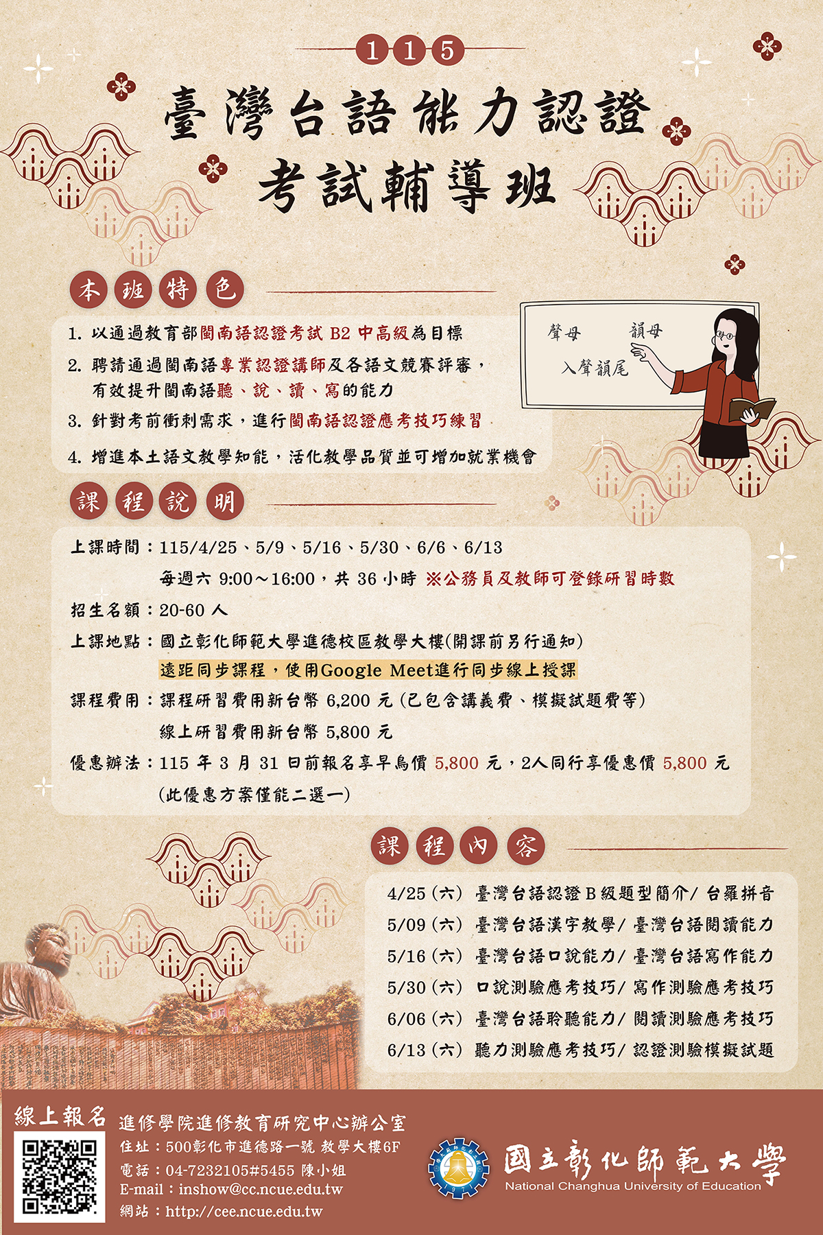 轉知國立彰化師範大學進修學院推廣教育課程「115年臺灣台語認證基礎班-台羅拼音」、「115年臺灣台語能力認證考試輔導班」課程簡章訊息。