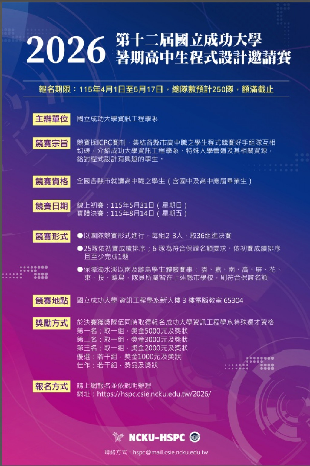本校資訊工程學系訂於115年5月31日舉辦「2026第十二屆國立成功大學暑期高中生程式設計邀請賽」線上初賽,並於115年8月14日進行實體決賽