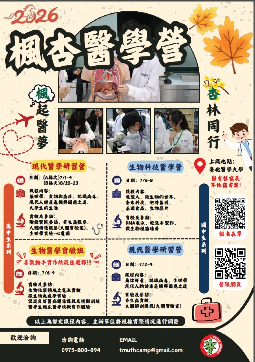 | (一) | 高中現代醫學研習營A梯,7/1-4,由楓杏醫學青年服務團辦理。 |