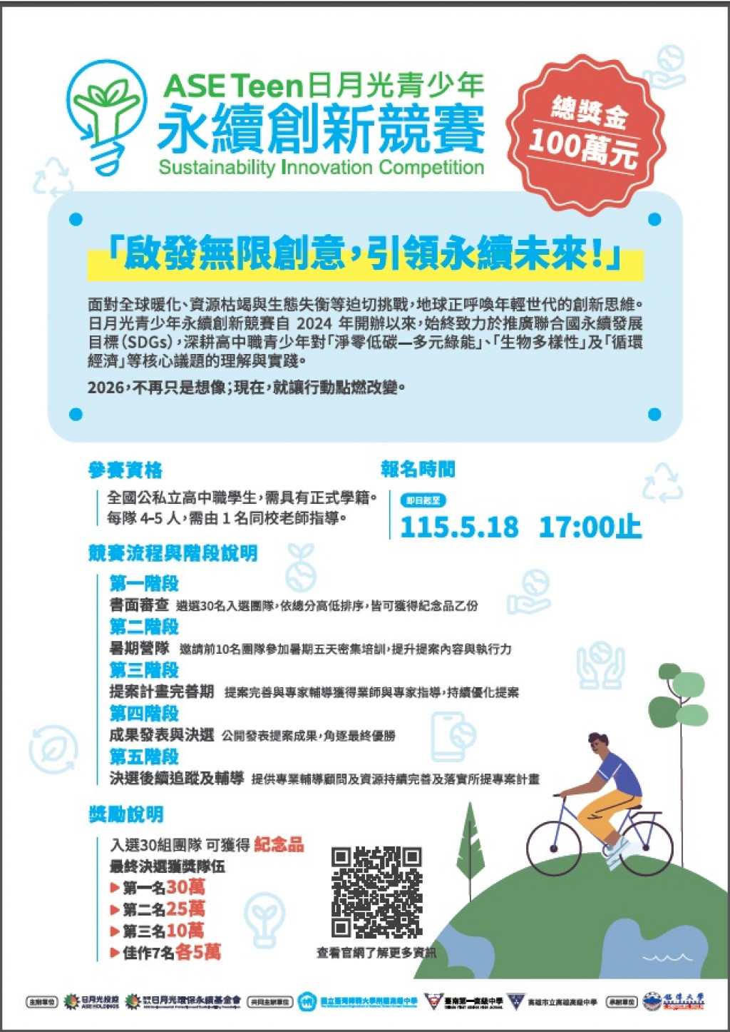 轉知:銘傳大學「2026日月光青少年永續創新競賽」徵件活動,報名期限至115年5月18日(星期一)止,敬邀學生踴躍報名參加