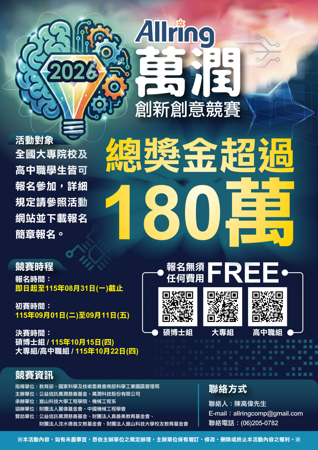 | 二、 | 辦理單位:主辦單位:公益信託萬潤慈善基金、萬潤科技股份有限公司;承辦單位:崑山科技大學工程學院、機械工程系;協辦單位:財團法人麗偉基金會、中國機械工程學會。 |