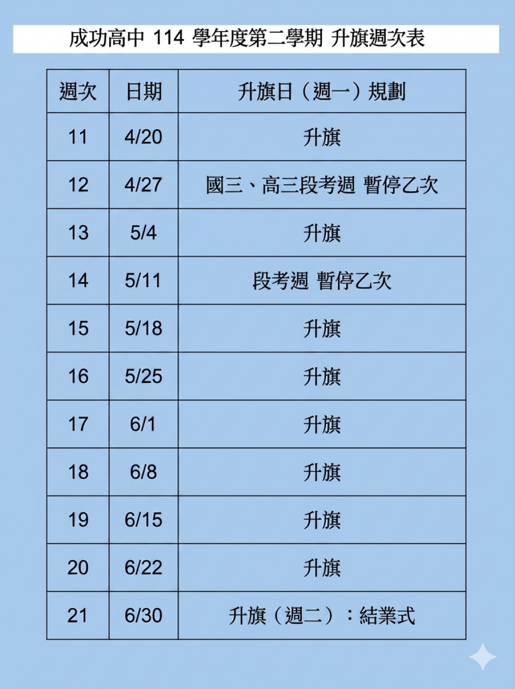 114學年度第二學期升旗周次表