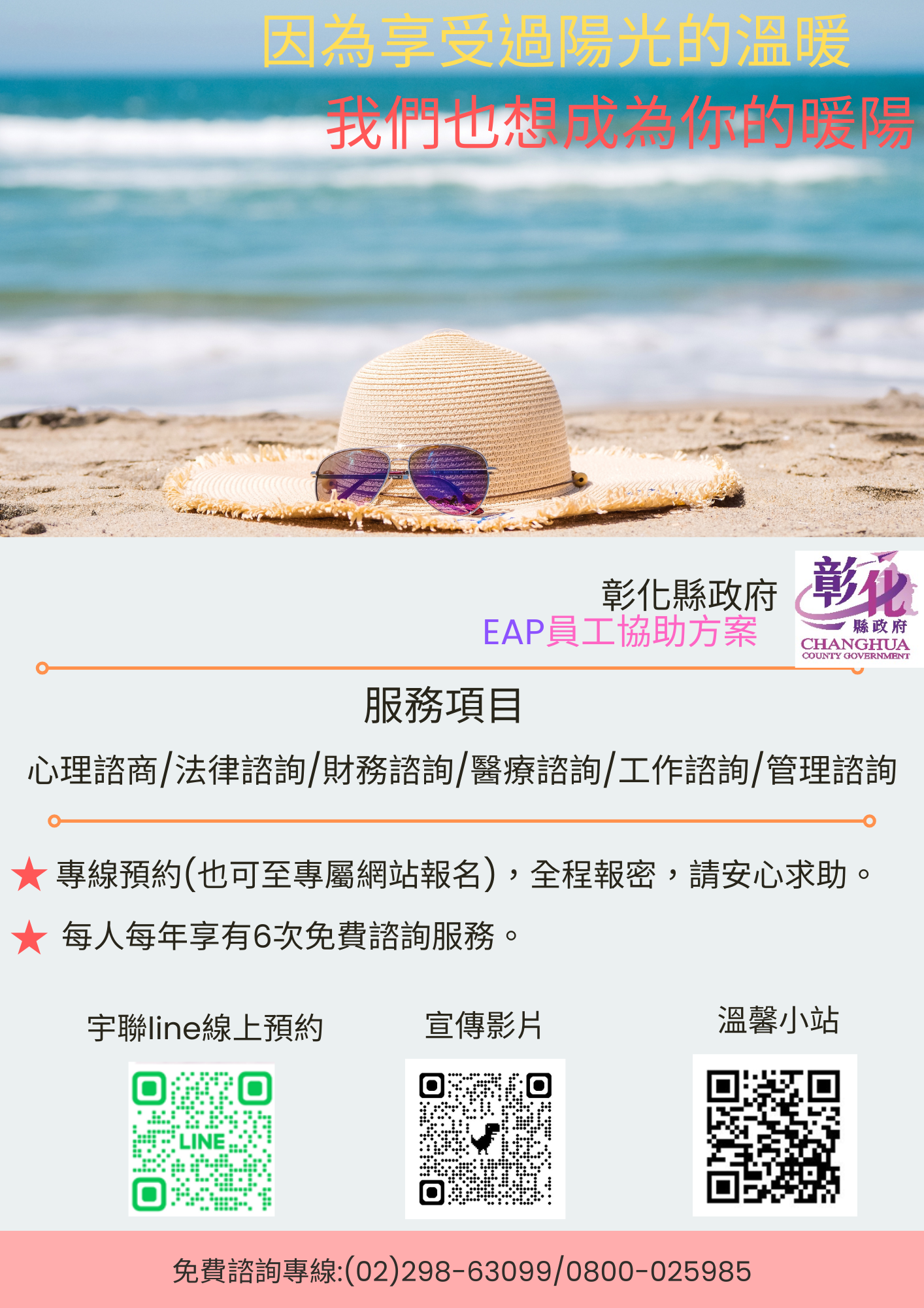 一、本府115年委託專業機構宇聯管理顧問有限公司,提供心理、醫療、財務、法律、工作及組織管理等六大面向專業諮詢服務。同仁如有使用需求可撥打EAP專線(02-29863099、0800-025985) 、透過溫馨小站(https://sites.google.com/view/changhuaeap)預約或由本府人事處EAP窗口協助(04-7531412)。