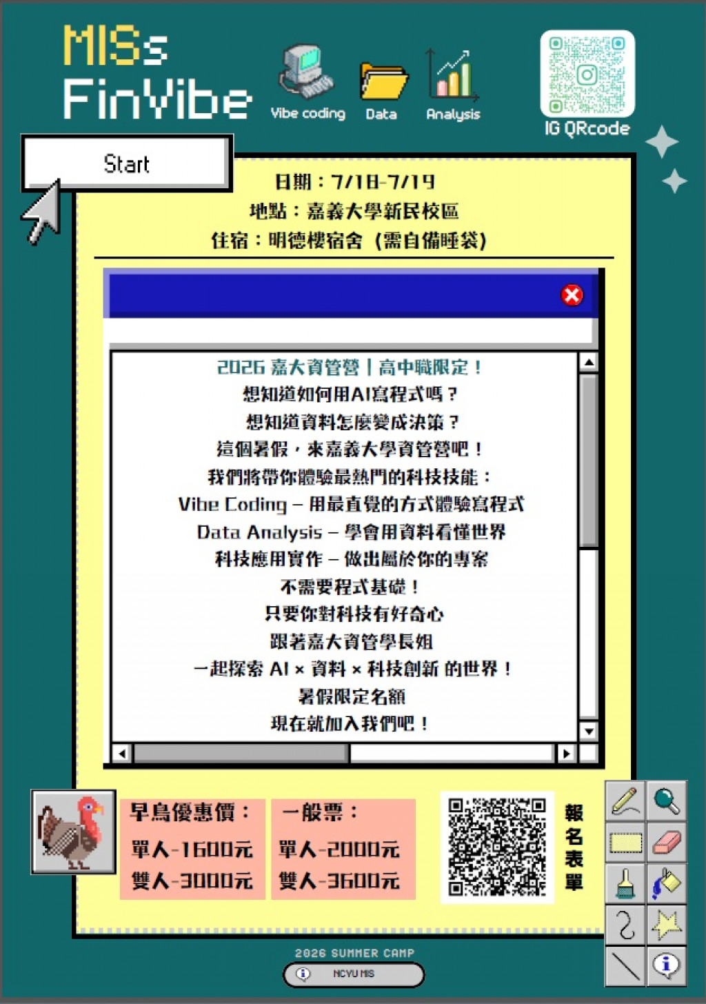 轉知:國立嘉義大學於暑假期間舉辦「2026嘉大資管探索營-MISs FinVibe 2026」活動海報乙份,自即日起開放報名