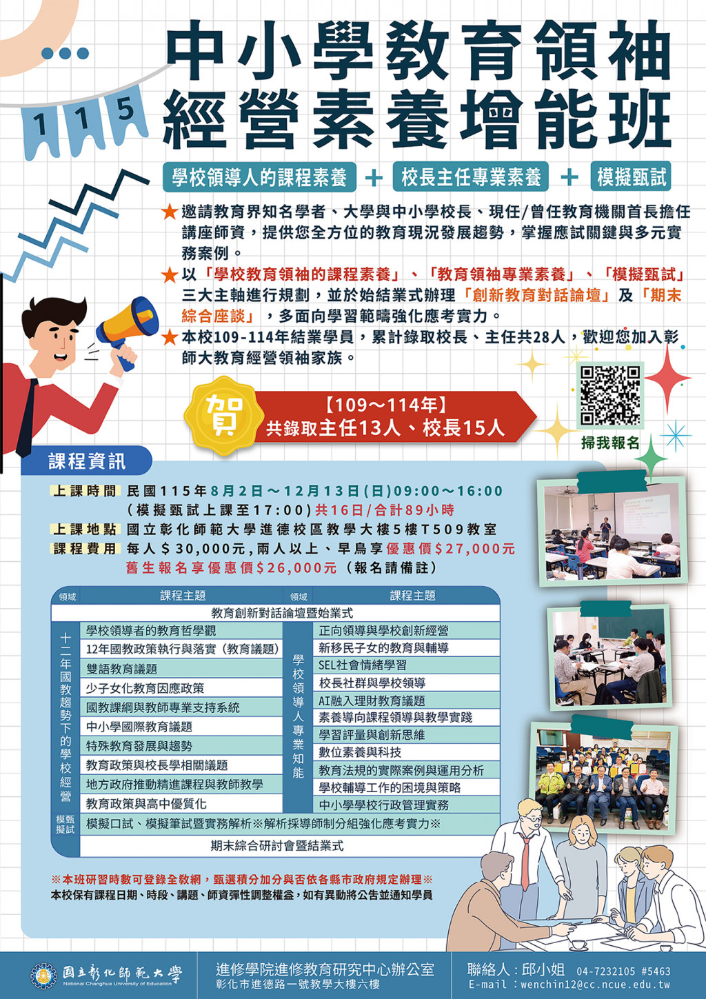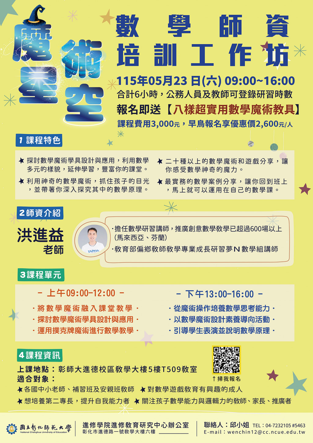 轉知:國立彰化師範大學進修學院推廣教育「魔術星空數學師資培訓工作坊」、「課後才藝安親照顧培訓師乙級鑑定輔導班」、「115年中小學教育領袖經營素養增能班」招生簡章