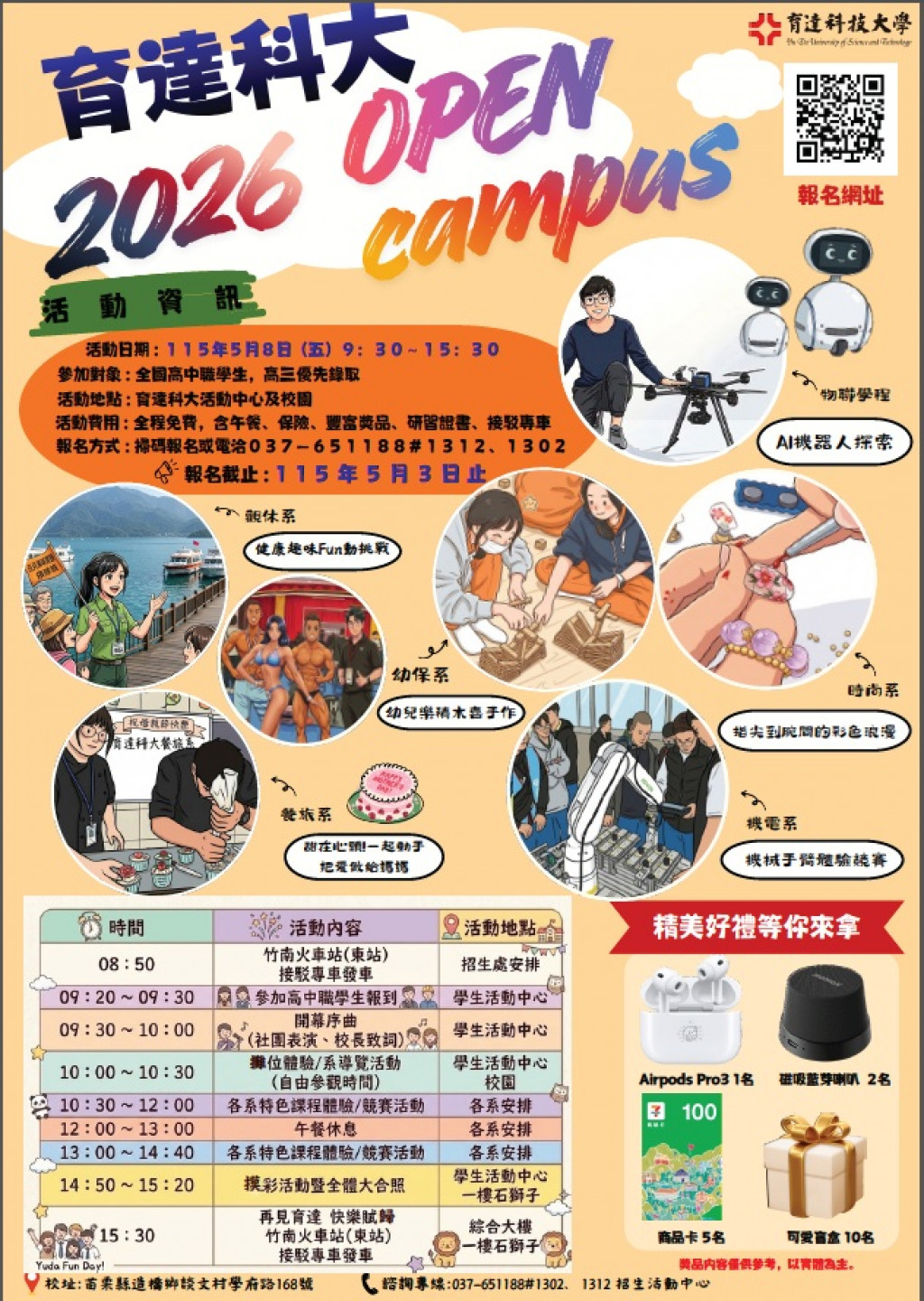 轉知:育達科技大學舉辦「2026 Open campus」活動,敬邀同學報名參加