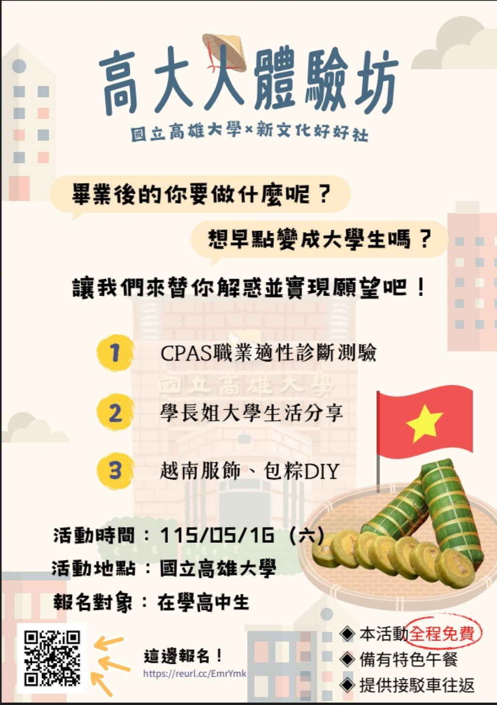 | (四) | 活動內容:包含CPAS職業適性診斷測驗、學長姊就讀經驗分享、越南服飾體驗及包粽DIY。 |