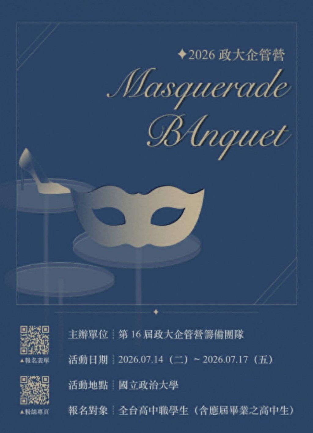 | 一、 | 活動目的:為發掘與栽培企業管理人才與潛能,以及促進全國高中學生對於政大企管系有更進一步的認識。設計多項深入淺出的企管相關課程,藉由活潑的活動將學術與實務層面結合,引導並鼓勵學員發展批判性思考與精準決策的能力,並使其在營隊中學習團體溝通與合作的互動技巧。 |