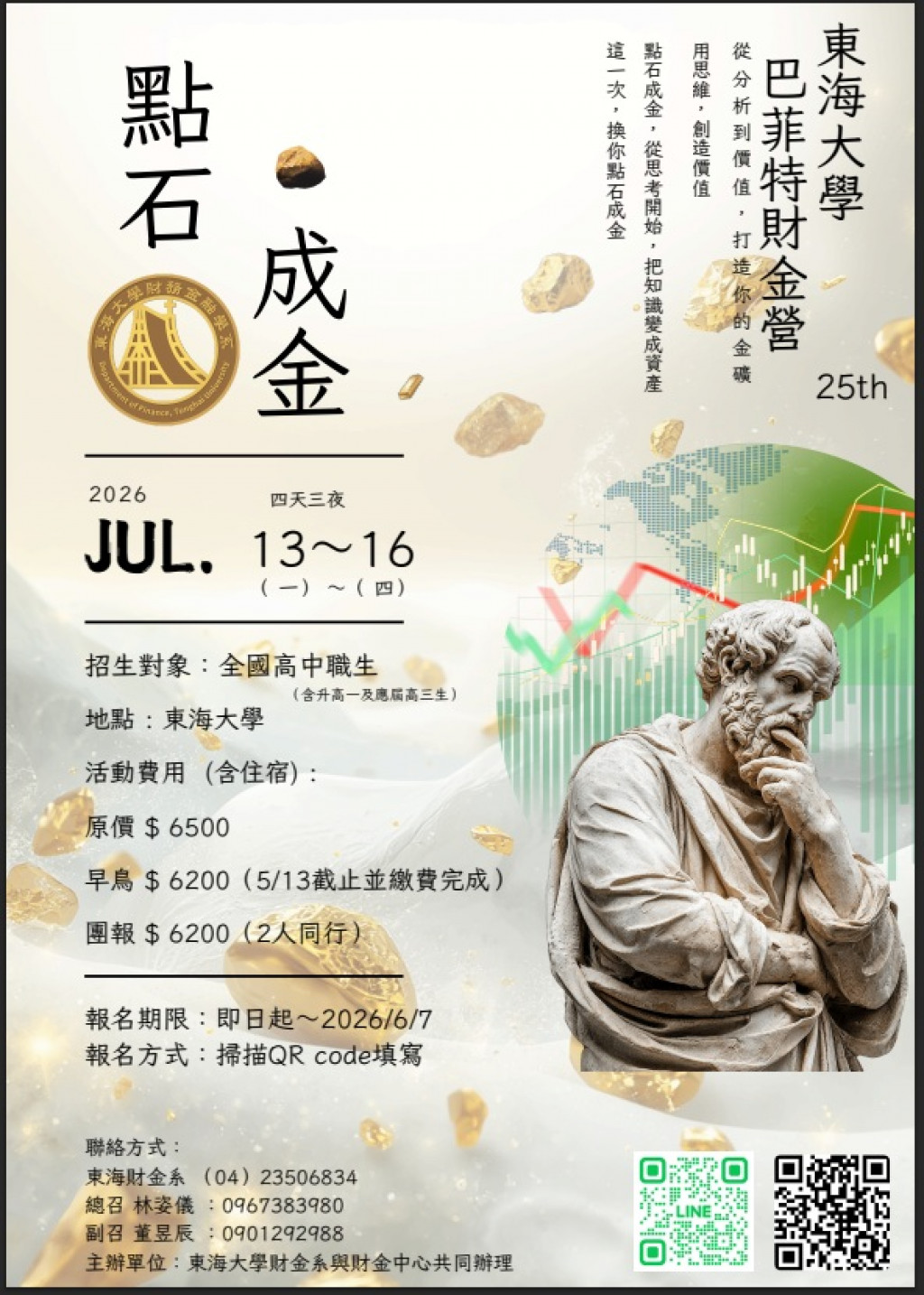 轉知:東海大學財務金融研訓中心謹訂於115年7月13~16日, 針對全國高中(職)生辦理4天3夜『第二十五屆東海財金巴菲特成長營』,敬邀學生踴躍報名參加
