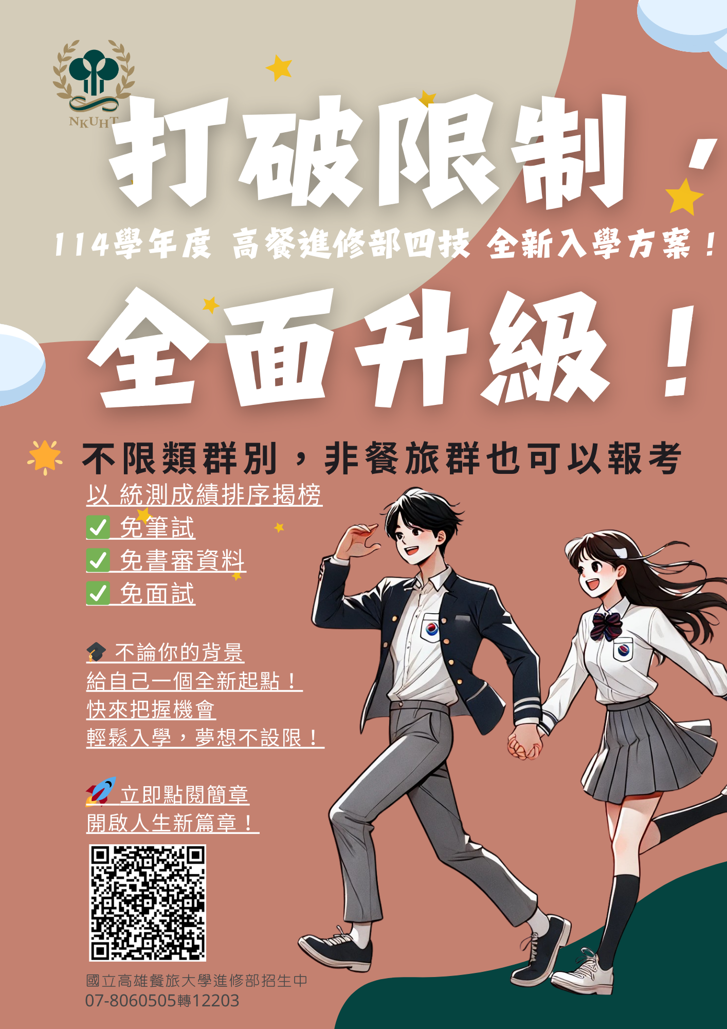 | 二、 | 報考資格、招生學系與名額等詳細資訊請參閱國立高雄餐旅大學招生簡章,公告於招生資訊網/學士班/四技進修獨招專區網頁(https://exam.nkuht.edu.tw/p/405-1044-35382,c1971.php?Lang=zh-tw)。 |